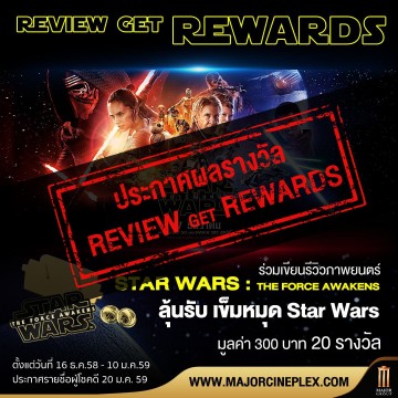 Star Wars ถือเป็นหนังมหากาพย์ระดับจักรวาลที่ฉายบนจอภาพยนตร์ 2 ไตรภาค และได้รับการยอมรับว่าเป็นหนังอวกาศไซไฟ-แฟนตาซียุคบุกเบิกของแท้ใครไปชม Star Wars Episode VII: The Force Awakens หรือ อุบัติการณ์แห่งพลัง ที่เป็นการเริ่มไตรภาคใหม่ สานต่อจากภาค 6 มาแล้ว อย่าลืมเข้าไปรีวิวความสนุก พร้อมติด แฮชแท็ก #ReviewGETRewards และ #Majorfriends เพื่อลุ้นรับของรางวัล จาก www.majorcineplex.com โดยรีวิวที่โดนใจทีมงานมากที่สุด ลุ้น รับเข็มหมุดสุดพิเศษ ของ Star Wars 20 รางวัล