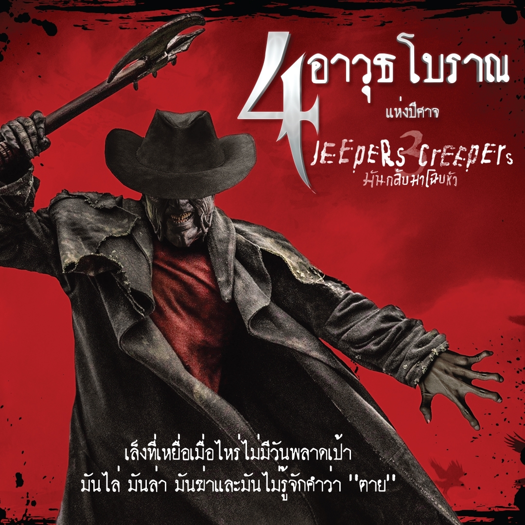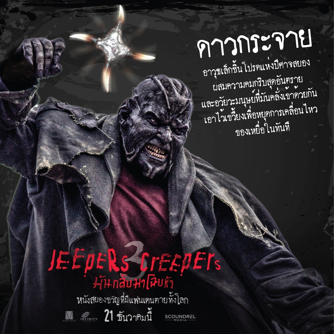 โดยในภาค 3 นี้จะบอกเล่าถึงเหตุการณ์ที่เกิดขึ้นในช่วงระหว่างภาคแรกและภาค 2 แฟนๆ ทุกคนจะได้เห็นถึงการลุกขึ้นมาต่อสู้ของเหล่ามนุษย์กับตัวปีศาจร้าย ซึ่งจากที่ผ่านๆ มาบรรดาเหยื่อผู้โชคร้ายยากจะหนีพ้น เดอะ ครีปเปอร์ มันจะใช้วิธีการสูดกลิ่น “ความกลัว” ด้วยจมูกทั้ง 3 รูของมัน ใช้กรงเล็บอันแหลมคมจิกเข้าไปที่หัวของเหยื่อ และที่ขาดไม่ได้คือ 4 อาวุธคู่กายประจำตัว งานนี้มนุษย์ทุกคนจะต้องรู้ไว้กันตาย! มาทำความรู้จักกับอาวุธของ เดอะ ครีปเปอร์ กันก่อนที่จะไปดู “Jeepers Creepers 3 มันกลับมาโฉบหัว”