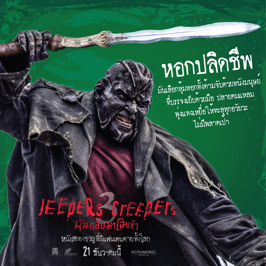ถึงเวลาที่ตำนานปีศาจไม่มีวันตายจะกลับมาอีกครั้ง พร้อมมหกรรมไล่ล่าโฉบกระชากหัวสุดสยองขวัญแบบมันส์ไร้ความปรานีให้โลกต้องจารึกกับ Jeepers Creepers 3 มันกลับมาโฉบหัว เรื่องราวของปีศาจโบราณที่ทุก 23 ปีมันจะตื่นขึ้นมาล่าเหยื่อ 23 วัน ไว้เป็นเสบียงชีวิตและจะกลับไปจำศีล ซึ่งความโคตรโหดของมันคือร่างกายที่แข็งแรงบวกกับมันสมองอันชาญฉลาด เจ้าตัว เดอะ ครีปเปอร์ นั้นมีความสูงกว่า 1.9 เมตร หนักถึง 158 กิโลกรัม บินไว กระโดดไกลเกิน 20 ฟุต ผิวหนังแข็งสีเขียว หนา แข็งแรง เสมือนผิวมังกร ที่สำคัญมันสามารถซ่อมร่างพังๆ ด้วยการกินชิ้นส่วนมนุษย์มาแทนที่