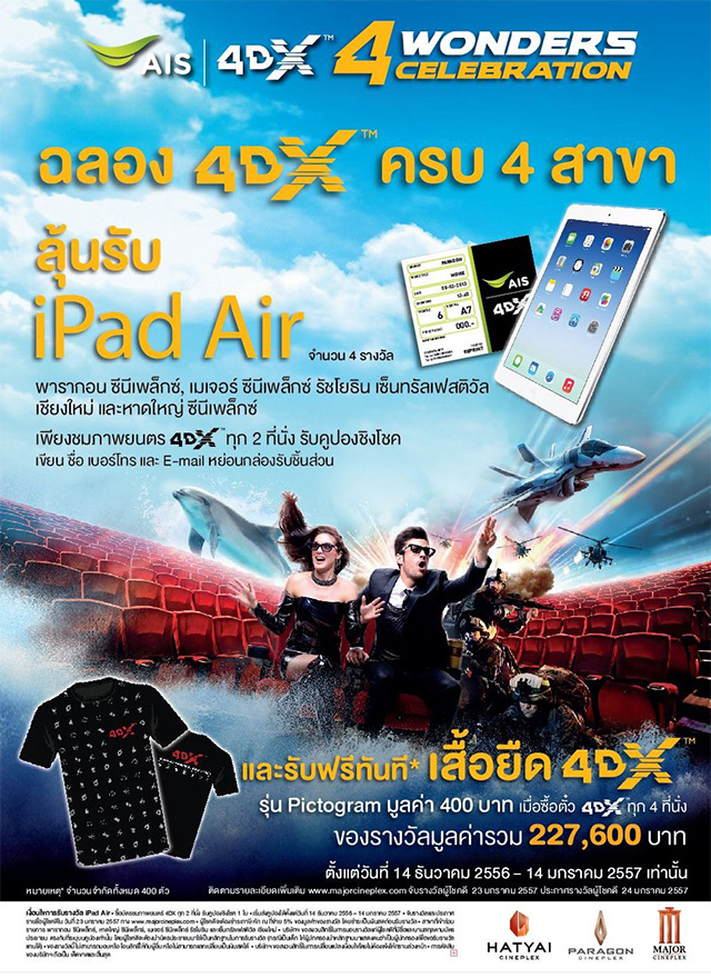 ประกาศรายชื่อผู้โชคดีจาก โปรโมชัน AIS 4DX 4 Wonders Celebration ฉลอง4DX ครบ 4 สาขา ผู้โชคดี 4 ท่าน ที่ได้รับ iPad Air คนละ 1 เครื่อง รวมมูลค่า 67,600 บาท 1.คุณ สมบุญ อิทธิสุนทร 081-4973XXX 2.คุณ วรารัตน์ จูเจริญ 085-3938XXX 3.คุณ บุญเสริม สัมมนาวงศ์ 086-9000XXX 4.คุณ รัตน์ชนู อนุบัน 089-5546XXX หมายเหตุ : ผู้โชคดีที่ได้รับรางวัลฯทางบริษัทจะเป็นผู้ติดต่อและดำเนินการมอบรางวัล