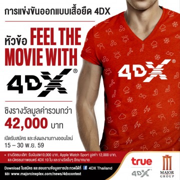 Major Cineplex Group ร่วมกับ True l 4DX จัดการแข่งขันออกแบบเสื้อยืด 4DX ในหัวข้อ “Feel the movie with 4DX” มาแสดงฝีมือและความคิดสร้างสรรค์ของคุณ ส่งผลงานเข้ามาประกวดกับเรา ชิงรางวัลร่วมมูลค่ากว่า 42,000 บาท