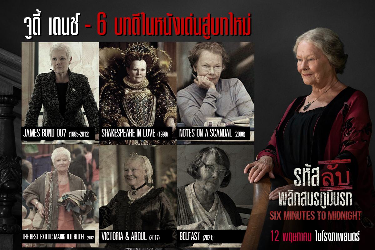 และความเข้มข้นครั้งใหม่ที่จะมาท้าทายบทบาททางการแสดงของ จูดี้ เดนซ์อีกครั้ง กับภาพยนตร์ทริลเลอร์ สายลับ “Six Minutes to Midnight รหัสลับพลิกสมรภูมินรก”จากเรื่องจริงของหน้าประวัติศาตร์สงครามโลกครั้งที่ 2 ได้แรงบันดาลใจจากสถานที่จริง ที่เคยเป็นโรงเรียนของเหล่าลูกสาวชนชั้นสูงพรรคนาซีช่วงเวลาก่อนการเปลี่ยนแปลงโลกครั้งใหญ่ปี 1939 กับบท “อาจารย์ใหญ่มิสร็อกฮอลล์” ครูใหญ่แห่งสถาบันออกัสตา-วิกตอเรีย แม้ลูกศิษย์จะเป็นลูกหลานนาซี แต่เธอก็รัก และปกป้องเหล่าเด็กสาวสุดหัวใจ ร่วมด้วยนักแสดงแถวหน้าอีกคับคั่ง ทั้ง เอ็ดดี อิซซาร์ด (Ocean’s Thirteen), คาร์ลา จูรี (Blade Runner 2049), เจมส์ ดารซีย์( Agent Carter) และ จิม บรอดเบนซ์ (Iris) ผลงานจากผู้กำกับ แอนดี กอดดาร์ด (Downton Abbey)  “Six Minutes to Midnight รหัสลับ พลิกสมรภูมินรก” 12 พฤษภาคมในโรงภาพยนตร์