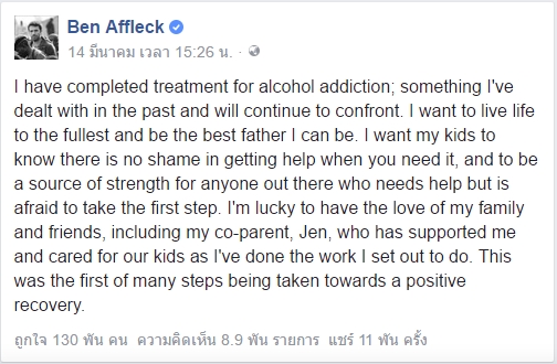 เบน แอฟเฟล็คได้โพสข้อความลงบนเฟซบุกส่วนตัว (@BenAffleck) เปิดเผยว่า  “ผมได้ผ่านการรักษาการติดสุราเสร็จสิ้นแล้วเรียบร้อย เป็นสิ่งที่ผมต้องรับมือในอดีตและต้องเดินหน้าต่อไป ผมอยากที่จะใช้ชีวิตได้อย่างเต็มที่และเป็นพ่อที่ดีที่สุดเท่าที่จะเป็นได้ ผมอยากให้ลูกๆ ได้รู้ว่าไม่ใช่เรื่องน่าอายเลยที่จะไปเข้ารับการช่วยเหลือเมื่อเราต้องการ”