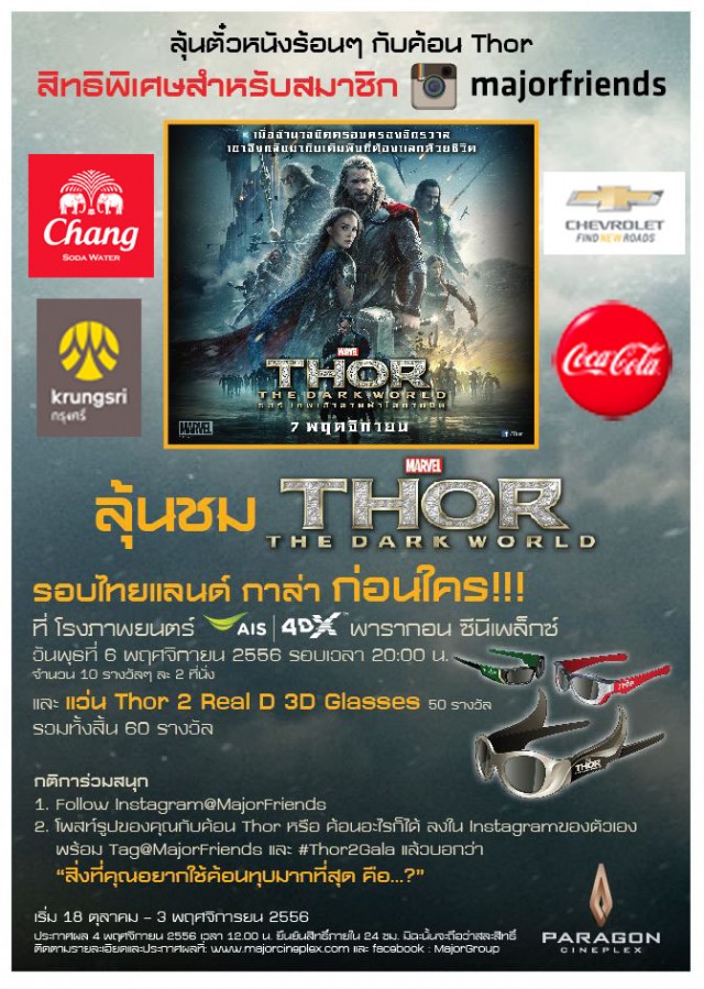 สิทธิพิเศษสำหรับสมาชิก Instagram MajorFriends ลุ้นชมเทพเจ้าสายฟ้า Thor : The Dark World รอบไทยแลนด์ กาล่า พรีเมียร์ ก่อนใคร