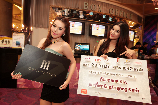 เมเจอร์ ซีนีเพล็กซ์ กรุ้ป ฉลองครบรอบ 2 ปี บัตรสมาชิก M Generation กับยอดสมาชิกคนรักหนัง 2 ล้านใบ ด้วยโปรโมชั่นพิเศษคืนกำไรให้สมาชิกที่ชมภาพยนตร์ในเครือเมเจอร์ ซีนีเพล็กซ์ กรุ้ป ทุก 1 ที่นั่ง ทุกเรื่อง ทุกรอบ ทุกสาขาทั่วประเทศ (ยกเว้น นนทบุรี และ บิ๊กซีนวนคร) ตั้งแต่วันนี้ ถึง 31 กรกฎาคม ลุ้นรับรถยนต์ KIA รุ่น Soul 1 คัน มูลค่า 1,397,000 ล้านบาท และ ที่พักรีสอร์ทริมทะเลสุดหรู 5 แห่ง คือ X2 กุยบุรี, X2 สมุย, Away เกาะกูด, Le Bayburi ปราณบุรี และ Bundara on Sea ระยอง จำนวน 13 รางวัล รวมมูลค่าของรางวัลกว่า 1.7 ล้านบาท ประกาศรายชื่อ ผู้โชคดีวันที่ 16-31 สิงหาคม 2556 ทาง www.majorcineplex.com
