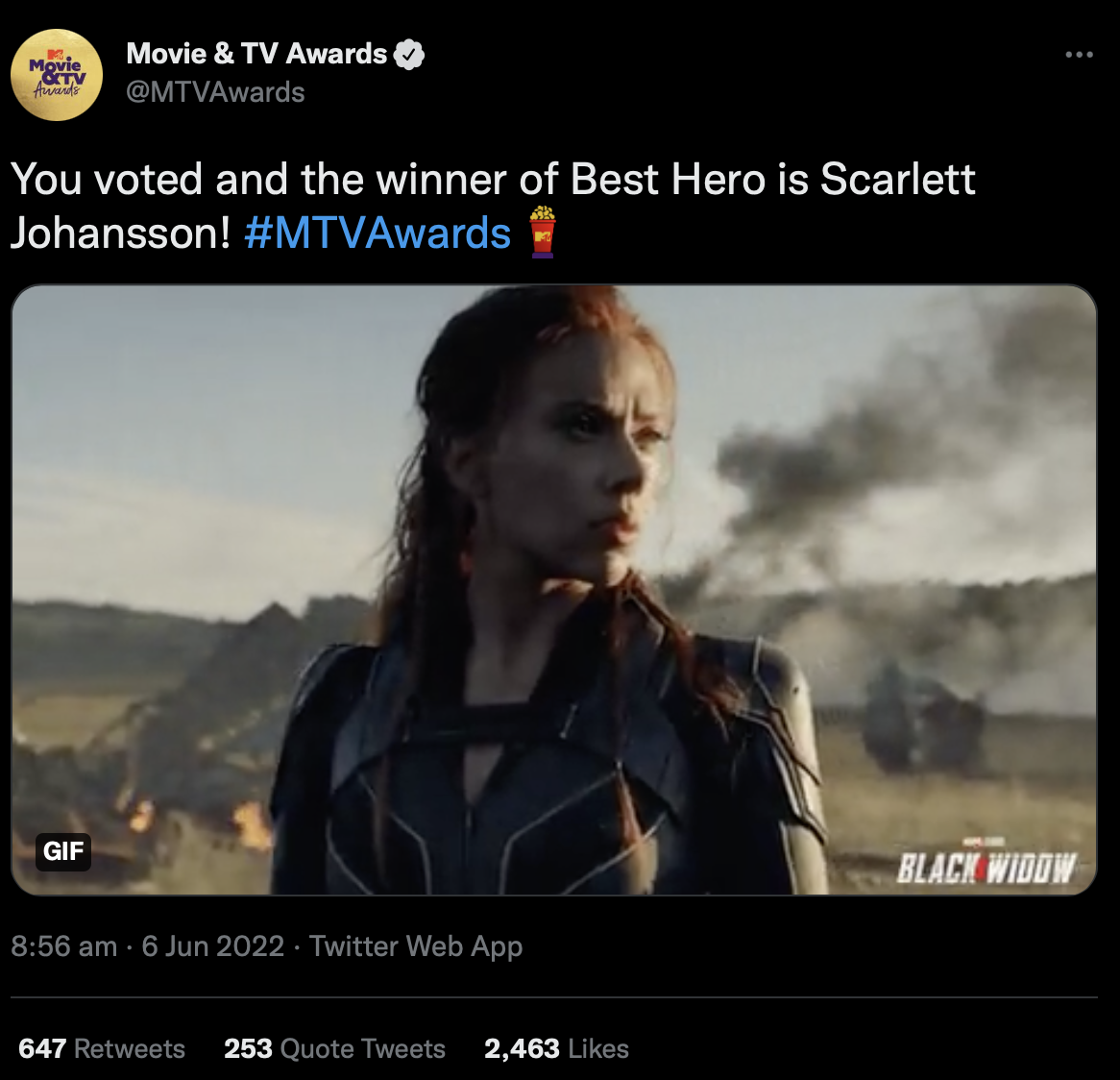 ล่าสุดนั้น ได้มีการประกาศรางวัลของ MTV Movie & TV Awards ไป สำหรับสาขา ฮีโร่ที่ดีที่สุดในปี 2022 นั้น สการ์เล็ตต์ โจแฮนส์สัน ได้รับการโหวตให้ได้รับชัยชนะไปอย่างท่วมท้นกับบทบาท “Black Widow” ในสาขา Best Hero