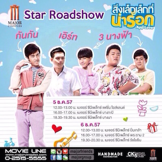 วันศุกร์ที่ 5 ธันวาคม 2557 12.00 – 13.00 น. เมเจอร์ ซีนีเพล็กซ์ แฟชั่น ไอซ์แลนด์ 16.00 – 17.00 น. เมเจอร์ ซีนีเพล็กซ์ บางกะปิ 18.30 – 19.30 น. เมเจอร์ ซีนีเพล็กซ์ เซ็นทรัลบางนา วันเสาร์ ที่ 6 ธันวาคม 2557 12.00 – 13.00 น. เมเจอร์ ซีนีเพล็กซ์ ปิ่นเกล้า 16.00 – 17.00 น. เมเจอร์ ซีนีเพล็กซ์ เซ็นทรัล พระราม 2 19.30 – 20.30 น. เมเจอร์ ซีนีเพล็กซ์ รัชโยธิน