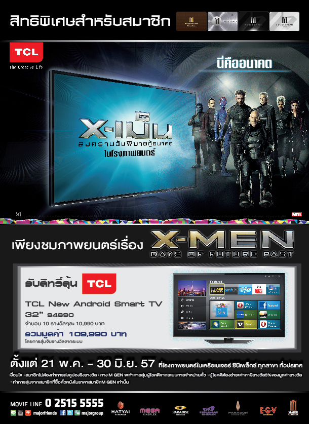 สิทธิพิเศษสำหรับสมาชิก MGENERATION CARD ชมภาพยนตร์เรื่อง X-Men : Days of Future Past รับ TCL New Android Smart TV 32’ S4690 จำนวน 10 รางวัลๆละ 10,990 บาท รวมมูลค่า 109,990 บาท