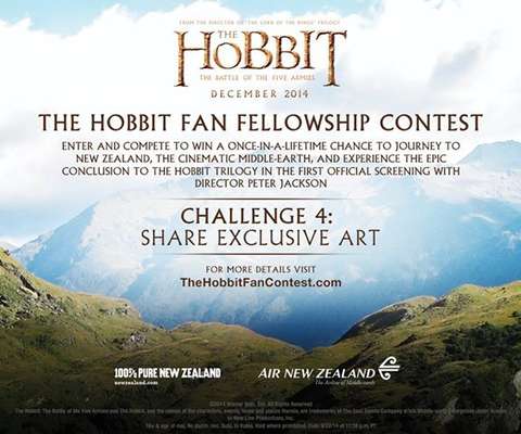 สาวกฮอบบิทไม่ควรพลาด!! กับภารกิจสุดท้ายกับการเสาะหาสุดยอดแฟนพันธุ์ฮอบบิท ร่วมทริปสุดเอ็กซ์คลูซีฟกับ ปีเตอร์ แจ็คสัน ที่ประเทศนิวซีแลนด์ กับกิจกรรม “THE HOBBIT FAN FELLOWSHIP CONTEST” ใน Challenge 4 นี้ จะเป็นการชมผลงานศิลปะสุดพิเศษจาก #HobbitFanContest ผลงานศิลปะสุดพิเศษจากภาพยนตร์เรื่อง The Hobbit: The Battle of the Five Armies