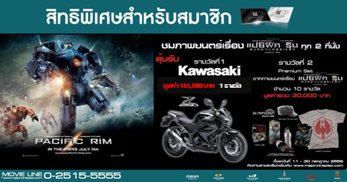 เงื่อนไข : 1. สมาชิกบัตร M GENERATION ที่ได้รับสิทธิ์ลุ้นรางวัลจะต้องชมภาพยนตร์เรื่อง Pacific Rim 2. รางวัลที่ 1 จะทำการ Random จากสมาชิกที่มีคะแนน 800 คะแนนขึ้นไป 3. รายชื่อสมาชิกทั้งหมดที่มีสิทธิ์ลุ้นรับรางวัลจะถูกส่งมาที่ระบบ ในวันที่ 1 สิงหาคม 56 และทำการ Random ผู้โชคดีในวันที่ 2 สิงหาคม 56 4. ประกาศรายชื่อผู้โชคดีในวันที่ 5 สิงหาคม 56 ทาง www.majorcineplex.com 5. สำหรับผู้ที่ได้รับรางวัลที่ 1 จะต้องชำระภาษี หัก ณ ที่จ่าย 5% ของมูลค่าของรางวัล โดยชำระเป็นเงินสดก่อนรับของรางวัล 6. ผู้โชคดีมีสิทธิ์รับรางวัลเพียง 1 รางวัล เท่านั้น 7. กรุณาติดต่อรับของรางวัลภายในไม่เกิน วันที่ 30 สิงหาคม 56 ในวันและเวลาทำการ จันทร์-ศุกร์ เวลา 10.30 - 17.30 น. เท่านั้นที่เมเจอร์ซีนีเพล็กซ์สาขารัชโยธิน ชั้น M โทร 02 511 5427 ต่อ 254 หากไม่มารับของรางวัลในระยะเวลาที่กำหนดถือว่าสละสิทธิ์ 8. พนักงานของบริษัท เมเจอร์ ซีนีเพล็กซ์ กรุ้ป จำกัด (มหาชน) และ คณะกรรมการดำเนินรายการ พร้อมทั้งครอบครัว ไม่มีสิทธิ์เข้าร่วมรายการ 9. บริษัทฯ ขอสงวนสิทธิ์ในการมอบรางวัลแก่ผู้โชคดีที่มีชื่อ - นามสกุลตรงตามบัตรประชาชน และตรงกับบัตรสมาชิก M GENERATION เท่านั้น โดยผู้โชคดีจะต้องนำบัตรประชาชนมาใช้เป็นหลักฐานในการรับรางวัล (กรณีเป็นเด็ก ให้ผู้ปกครองนำหลักฐานมาแสดงตน ว่าเป็นผู้ปกครองเพื่อขอรับรางวัลแทนได้) 10. ของรางวัลนี้ไม่สามารถมอบหรือ โอนสิทธิ์ให้กับผู้อื่น หรือไม่สามารถแลกเปลี่ยนเป็นเงินสดได้ 11. ผู้ได้รับรางวัลต้องรับผิดชอบค่าจดทะเบียน ค่าพรบ. หรือค่าใช้จ่ายอื่นๆที่เกี่ยวข้องเอง 12. บริษัทฯ ขอสงวนสิทธิ์ในการเปลี่ยนแปลงเงื่อนไขโดยไม่ต้องแจ้งให้ทราบล่วงหน้า 13. การตัดสินของบริษัทฯ ถือเป็นเด็ดขาดและสิ้นสุด