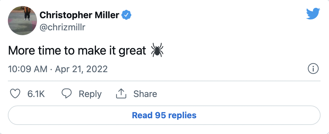 แต่ล่าสุดนั้น โปรดิวเซอร์ของภาพยนตร์เรื่อง Spider-Man: Across the Spider-Verse อย่าง คริส มิลเลอร์ ได้ออกมายืนยันด้วยตนเองผ่านทางทวิตเตอร์ของเขาถึงการเลื่อนกำหนดการฉายบนโรงภาพยนตร์ทั่วโลกไปถึง 8 เดือน