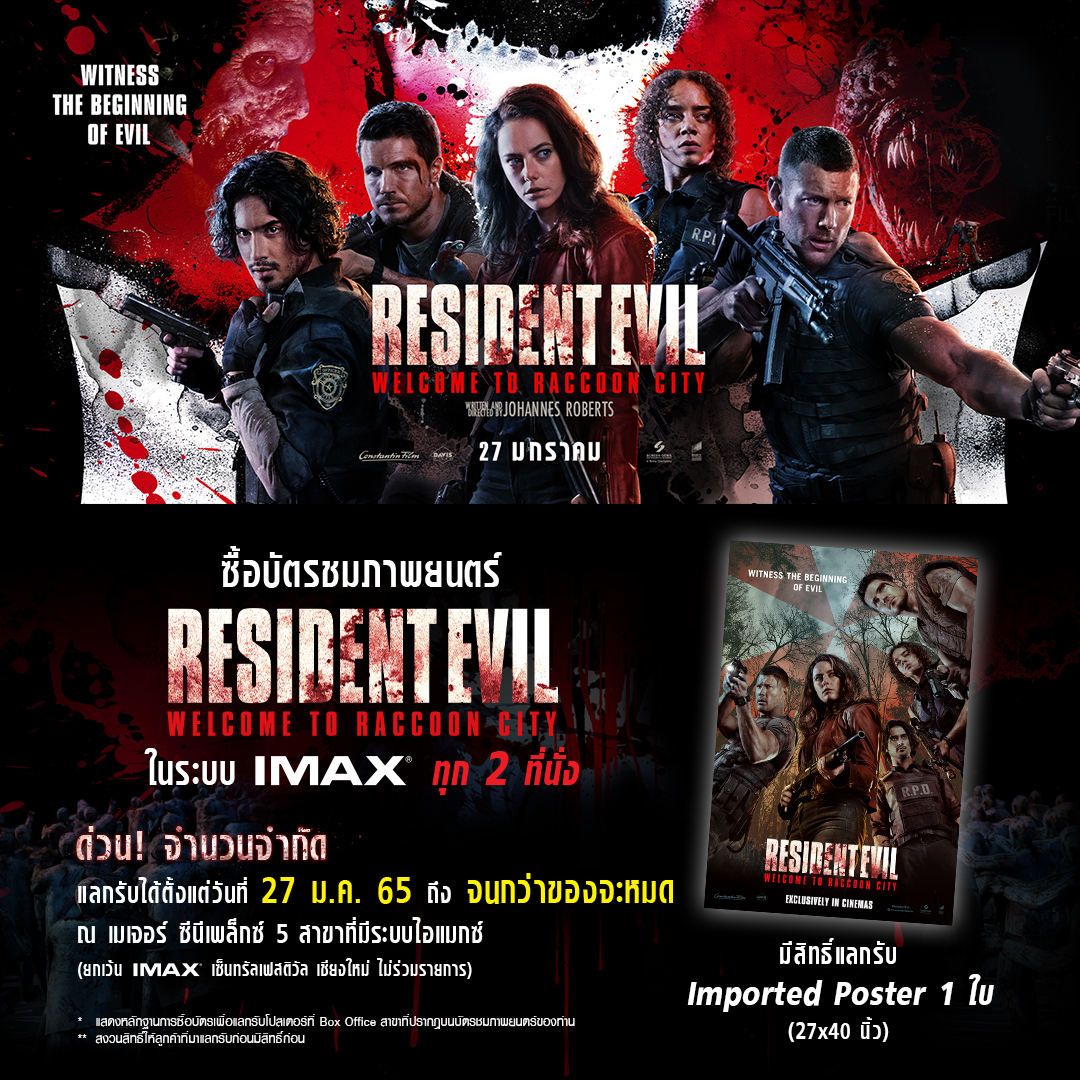 • ซื้อบัตรชมภาพยนตร์ล่วงหน้า“RESIDENT EVIL: WELCOME TO RACCOON CITY” เฉพาะระบบ IMAX ทุก 2 ที่นั่ง สามารถแลกรับโปสเตอร์แผ่นใหญ่ได้ฟรี 1 แผ่น