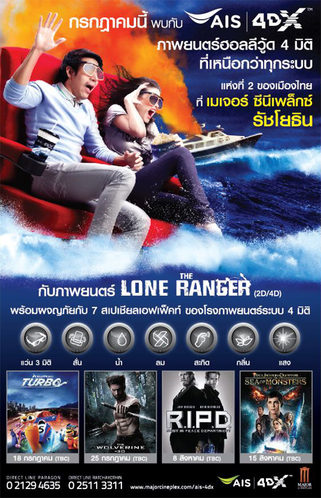 กรกฎาคม นี้ เตรียมพบกับ โรงภาพยนตร์ AIS 4DX ภาพยนตร์ฮอลลิวู้ด 4 มิติ ที่เหนือกว่าทุกระบบ แห่งที่ 2 ของเมืองไทย ที่ เมเจอร์ ซีนีเพล็กซ์ รัชโยธิน กับภาพยนตร์ The Lone Ranger (2D/4D)
