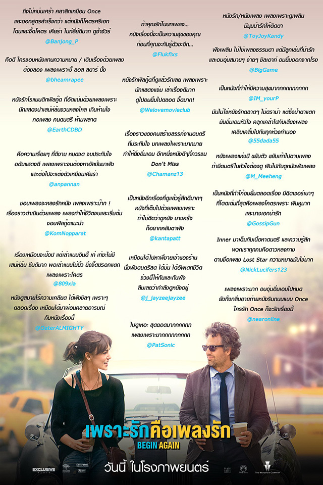 เกิดปรากฎการณ์ พร้อมใจโพสเชียร์หนัง “Begin Again: เพราะรักคือเพลงรัก” เมื่อสัปดาห์ที่ผ่านมาเหล่าบรรดาคนดัง ต่างพากันชื่นชม หนังรัก...ที่ใครๆก็รัก “Begin Again: เพราะรักคือเพลงรัก” ...ทุกเสียงชื่นชม ยกให้เป็นหนังรักแห่งปี...