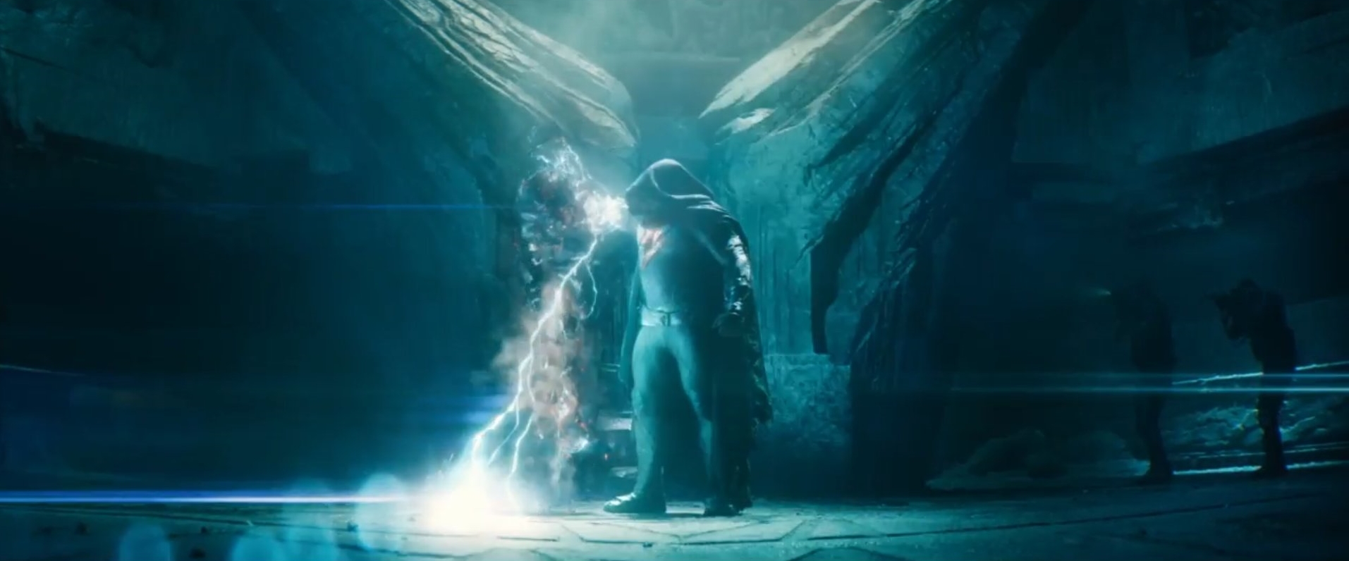 ฟุตเทจเริ่มต้นเป็นภาพเรือกำลังแล่นผ่านผืนน้ำแข็ง ขณะที่อดัมกำลังนิ่งงัน ก่อนที่ภาพจะตัดไปในตอนที่เขายังคงเป็นทาส ก่อนที่จะเกิดใหม่กลายเป็นเทพเจ้า อดัมพูดว่า ‘ข้าไม่คุกเข่าให้ใคร’ ก่อนที่ Doctor Fate จะพูดว่า “ข้ามองเห็นอนาคต สิ่งที่เจ้าเป็น ไม่ทำลายล้างโลกใบนี้ ก็เป็นผู้พิทักษ์มันไว้” แล้วฟุตเทจก็ตัดไปเป็นภาพ อดัมกำลังเดินอยู่กลางทะเลทราย ในตอนนั้นเองก็มีใครบางคนเล็งจรวดยิงใส่เขา เขาจับมันไว้ได้แล้วก็มันก็ระเบิดออก เขาไม่เป็นอะไรเลย แต่ดูอารมณ์เสียและมีสายฟ้าแล่บอยู่รอบตัวเขา