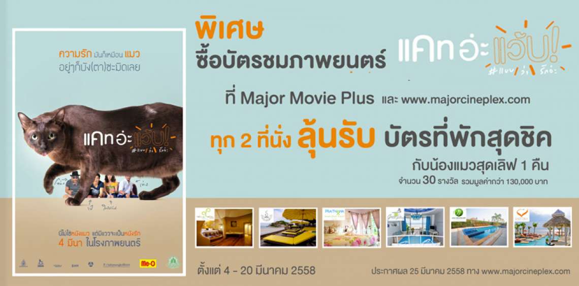 • สิทธิ พิเศษเฉพาะลูกค้าที่ซื้อบัตร เรื่อง แคท อ่ะ แว้บ! ทุก 2 ที่นั่ง ผ่านทาง Application “Major Movie Plus” และเว็บไซต์ www.majorcineplex.com โดยทำรายการชำระเงินผ่านเว็บไซต์ และ Application เท่านั้น