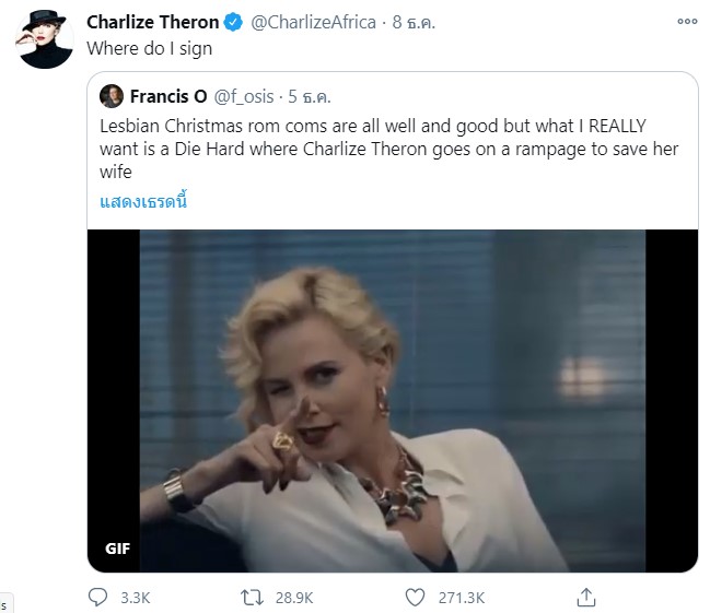 โดยแฟนหนังที่ออกมาเสนอความคิดนี้ก็คือ Francis O ที่ได้โพสต์ผ่านทวิตเตอร์ของตัวเองว่า “หนังเลสเบี้ยนโรแมนติกคอมเมดี้ในช่วงคริสมาสต์มันก็ดีอยู่หรอก แต่สิ่งที่ฉันต้องการจริง ๆ ก็คือ Die Hard ที่ชาร์ลีซ เทรัน มาระห่ำเดือดเพื่อช่วยชีวิตเมียของเธอต่างหาก”