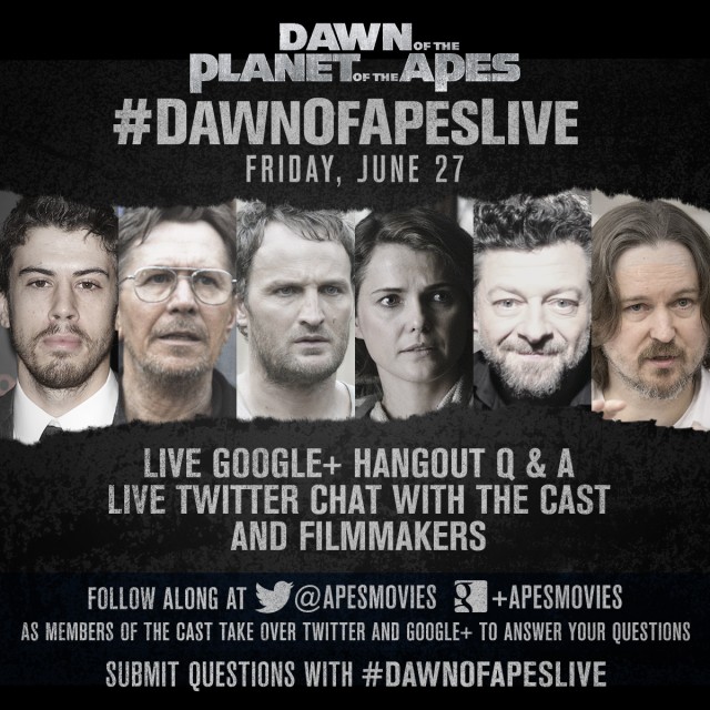 https://plus.google.com/+ApesMovies ในวันที่ 27 มิถุนายน เวลาประมาณ 02.30 น.(ตามเวลาประเทศไทย) โดย #DawnofApesLive