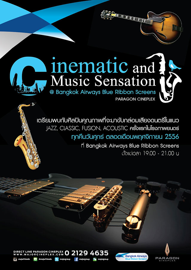 เตรียมพบกับศิลปินคุณภาพที่จะมาขับกล่อมเสียงดนตรีในแนว Jazz, Classic, Fusion, Acoustic ครั้งแรกในโรงภาพยนตร์ ทุกคืนวันศุกร์ ตลอดเดือน พฤศจิกายน 2556 ที่ Bangkok Airways Blue Ribbon Screens Lounge ชั้น 5 Paragon Cineplex ตั้งแต่เวลา 19.00 - 21.00 น.