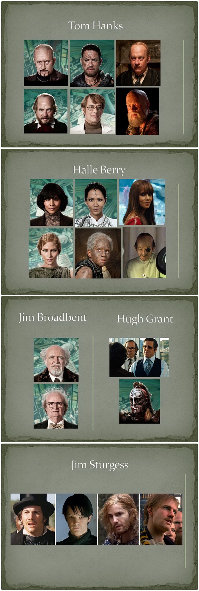 • Halle Berry (ฮัลลี่ เบอร์รี่) รับบท Valleysman Zachry (หญิงชราพื้นเมือง) / Jocasta (โจคาสต้า) / Luisa Rey (หลุยซ่า เรย์) / Dr.Ovid (ดร.โอวิด) / Meronym (เมโรนิม) / Indian Party Guest (หญิงสาวชาวอินเดีย)