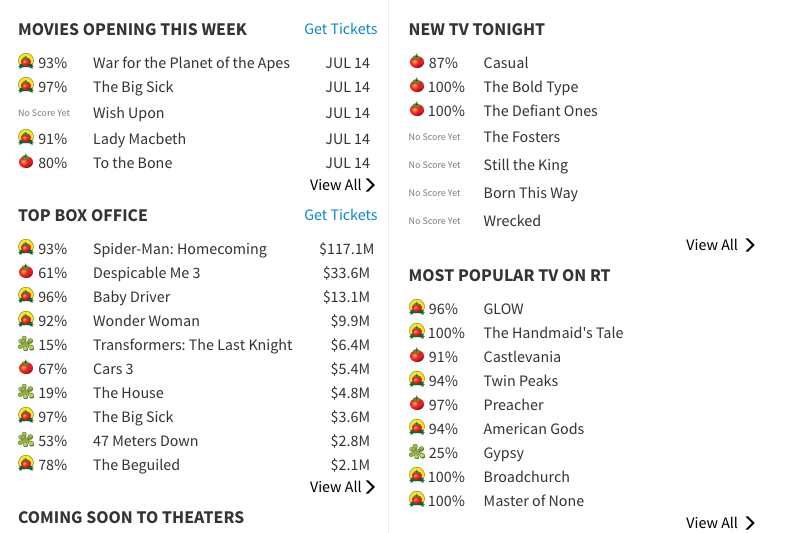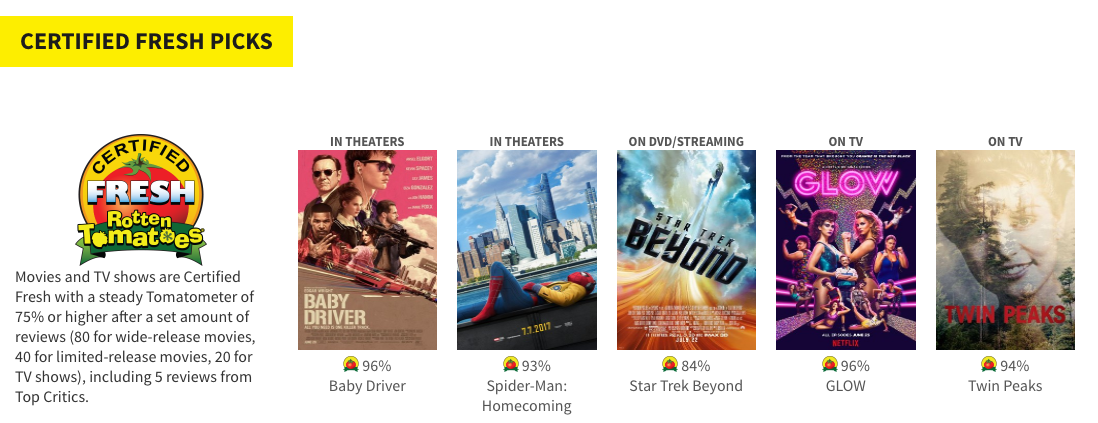 เริ่มจากเปอร์เซ็นทางด้านซ้าย ซึ่งหลายคนเข้าใจผิดบ่อยครั้งว่าคือคะแนนของหนัง ซึ่งจริงๆแล้วมันคือ เปอร์เซ็นต์ ของการรีวิวเชิงบวก ยกตัวอย่างเช่นภาพยนตร์เรื่อง Car3 ได้ 10% ก็หมายความว่า จากนักวิจารณ์ 100 คน มีคนชอบหนังเรื่องนี้ 10 คน ไม่ได้หมายความว่าหนังได้คะแนน 9/100 แต่อย่างใด