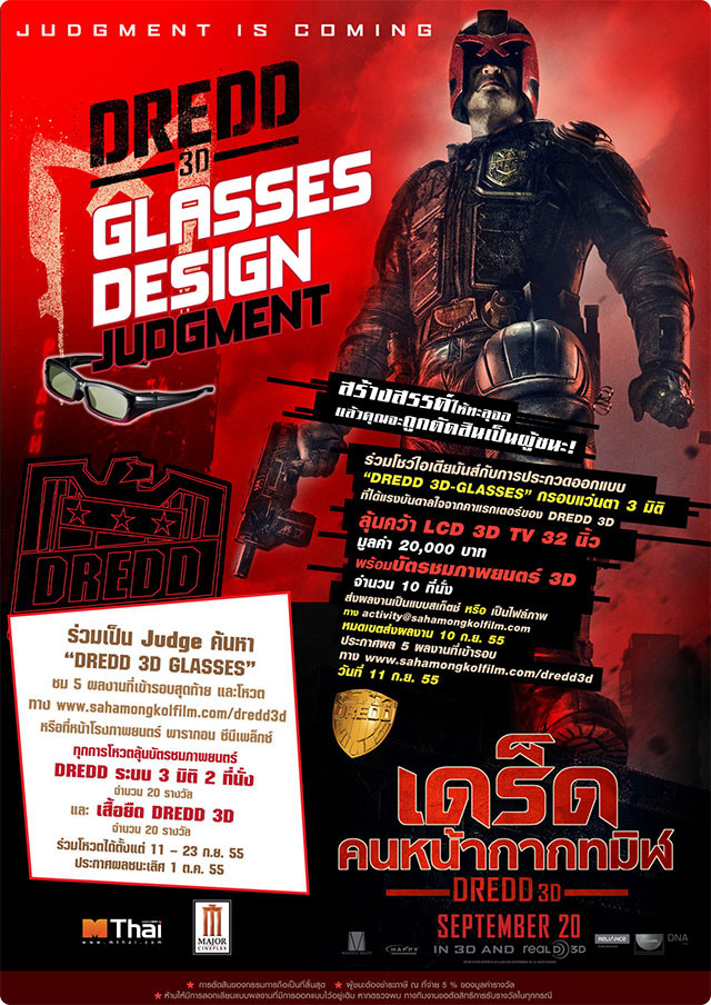 ร่วมโชว์ไอเดียมันส์กับการประกวดออกแบบ “DREDD 3D-GLASSES” กรอบแว่นตา 3 มิติ ที่ได้แรงบันดาลใจจากคาแรกเตอร์ของ DREDD 3D ลุ้นคว้ารางวัล.... LCD 3D TV 32 นิ้ว มูลค่า 20,000 บาท พร้อมบัตรชมภาพยนตร์ 3D จำนวน 10 ที่นั่ง