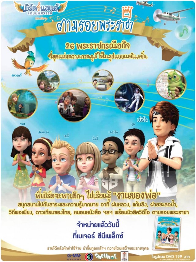 เพื่อเป็นการเฉลิมพระเกียรติ พระบาทสมเด็จพระเจ้าอยู่หัว ในวโรกาสเจริญพระชนมายุครบ 84 พรรษา และถ่ายทอดเรื่องราวพระอัจฉริยภาพและพระราชกรณียกิจต่างๆ เป็นสื่อให้ทั้งเยาวชน ครอบครัว คนรุ่นหลังได้รับความรู้และซาบซึ้งถึงพระมหากรุณาธิคุณที่พระองค์ท่านทรงทำเพื่อปวงชนชาวไทยทุกคน โดยถ่ายทอดออกมาในรูปแบบการ์ตูนแอนนิเมชั่น เบิร์ดแลนด์ แดนมหัศจรรย์ สนุกสนานไปกับสาระและความรู้มากมาย อาทิ ฝนหลวง, แก้มลิง, วิถึพอเพียง ฯลฯ พร้อมมิวสิควีดีโอ ตามรอยพระราชา เมเจอร์ ซีนีเพล็กซ์ จึงร่วมเป็นหนึ่งในการจัดจำหน่าย DVD เบิร์ดแลนด์ แดนมหัศจรรย์ ตามรอยพระราชา ตั้งแต่วันที่ 30 ต.ค. 55 – 31 ม.ค. 57 ซึ่งรายได้หลังหักค่าใช้จ่าย นำขึ้นทูลเกล้าฯ ถวายโดยเสด็จพระราชกุศลต่อไป รายละเอียดการจัดจำหน่าย: 1. DVD 1 ชุด มี 2 แผ่น 26 ตอน จัดจำหน่ายในราคา 199 บาท/ ชุด 2. จัดจำหน่ายเป็นจำนวน 18 สาขาดังต่อไปนี้