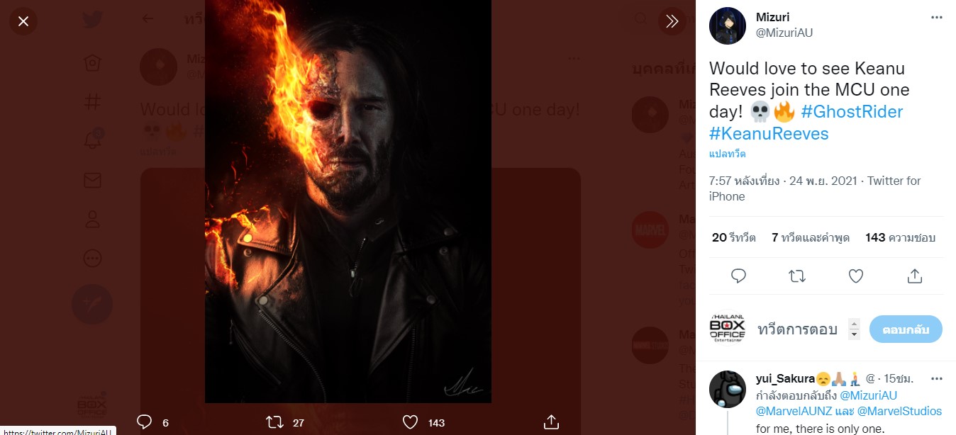 หลังจากที่คีอานู รีฟส์ ออกมาให้สัมภาษณ์ว่าสนใจอยากจะเข้าร่วมจักรวาลภาพยนตร์มาร์เวล แน่นอนว่าก่อนหน้านี้มีข่าวคราวลือออกมาเสมอ รวมถึงบรรดาแฟนแคสต์ที่อยากให้เขามารับบทเป็นซูเปอร์ฮีโร่ใน MCU หนึ่งในตัวละครที่แฟน ๆ อยากให้เขามารับบทมากที่สุดก็คือ จอห์นนี เบลซ หรือ Ghost Rider ผู้พิพากษาหัวกะโหลกไฟจากนรก จนตอนนี้มีศิลปินลงมือสร้างภาพแฟนอาร์ตออกมาแล้ว และศิลปินคนนั้นก็คือ Mizuri ที่ได้โพสต์ภาพเนรมิตมิสเตอร์ไนซ์กายของพวกเรา ให้กลายเป็นฮีโร่กะโหลกไฟ แล้วเผยแพร่ผ่านทวิตเตอร์ของตัวเอง (@MizuriAU)