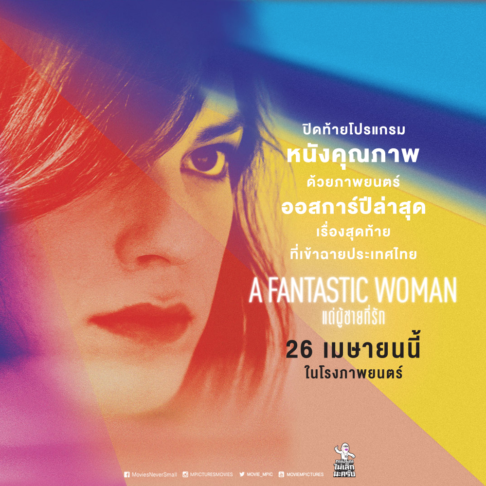 เตรียมพบอีกแง่มุมของความรักที่ความตายมิอาจพราก กับหนึ่งในภาพยนตร์คุณภาพจากโปรเจกต์ “หนังผมไม่เล็กนะครับ: LIPSTICK MOVIES” ใน “A FANTASTIC WOMAN (อะ แฟนทาสทิค วูแม่น) แด่ผู้ชายที่รัก” มีกำหนดเข้าฉายให้คอหนังเมืองไทยได้พิสูจน์คุณภาพทั้งด้านการแสดงทีเหนือชั้นและเรื่องราวสุดประทับใจ 26 เมษายนนี้ ในโรงภาพยนตร์