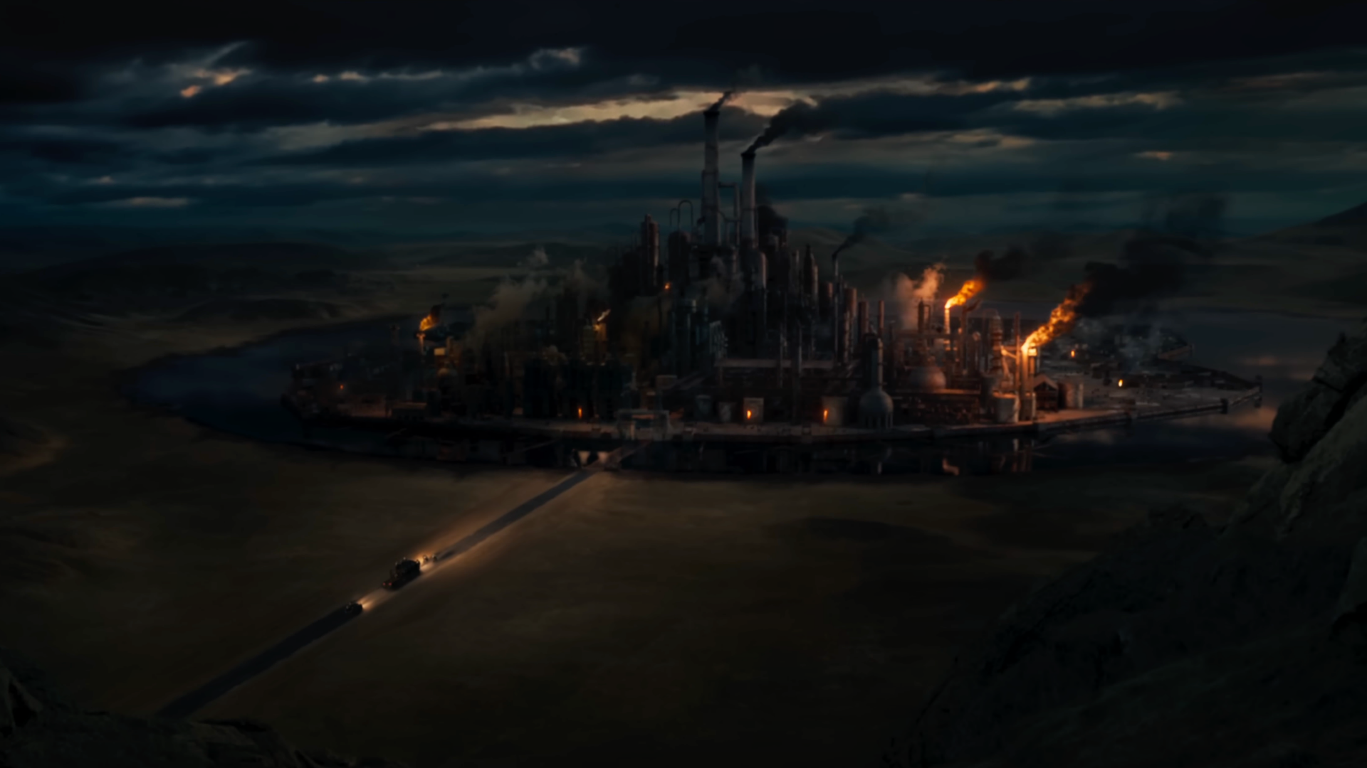 สำหรับ แก๊สทาวน์ ให้เรานึกถึงฉากเหล่านั้นด้วยคูเวต โครงเหล็กจะตั้งอยู่บนไฟ พวกอูฐและทะเลทราย ฝุ่นทราย ต่างเปรอะเปื้อนไปด้วยธาตุกำมะถันและสีดำ แก๊สทาวน์ โดยหลักมีหน้าที่ส่งน้ำมันจากกลางดินแดนอันไร้ทิศทาง ยังคงมีการสูบน้ำมัน ผลิตน้ำมัน และหาเงิน เราไม่เคยเรียนรู้บทเรียนในอดีต เราต้องการเชื้อเพลิงเพื่อทำการต่อสู้ต่อไป เพื่อขับรถ เพื่อซื้ออาวุธ… ป้อมปราการ แก๊สทาวน์ ทำให้เราเห็นรายละเอียดในด้านที่ต่างออกไปของชีวิต