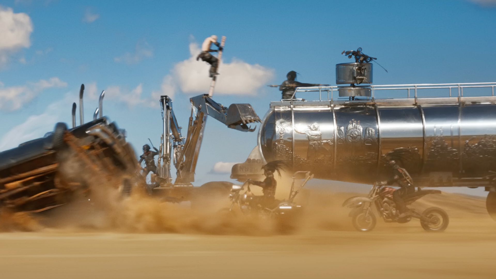 กาย นอร์ริส (ผู้ออกแบบฉากแอ็คชั่น) : เมื่อเราต้องออกแบบฉากแอ็คชั่นในเรื่อง “Furiosa” และต้องคำนึงถึงเรื่องความปลอดภัย เราเริ่มคิดถึงการใช้เทคโนโลยีโมชั่นแคปเจอร์ สิ่งที่เราพัฒนาขึ้นมาคือระบบที่ใช้ความเฉื่อยและชุดโมชั่นแคปเจอร์ ผสมกับการใช้ลวดสลิงขึ้นแบบเดียวกับที่เคยใช้ในเรื่อง “Fury Road” จากนั้นนำมารวมกัน ฉากแอ็คชั่นในเรื่อง in “Furiosa” เหมือนกับในเรื่อง “Fury Road” ทุกอย่างเกิดขึ้นโดยอาศัยร่างกายและการเคลื่อนไหวของนักแสดงทุกคน แต่สิ่งที่เราทำได้คือการรวมฉากมอเตอร์ไซค์ชนกันรุนแรงเข้ากับโมชั่นแคปเจอร์ โดยพื้นฐานคือนักแสดงทุกคนและนักแสดงผาดโผนทุกคนต้องมีการขยับตัว ตอนนี้ที่เราต้องทำคือฉากรถชนกันเกิดขึ้นโดยนักแสดงสวมชุดโมชั่นแคปเจอร์และเราเก็บข้อมูลเอาไว้ ทุกคนมีร่างอวาตาร์ของตัวละครนั้น จากนั้นเราจะนำข้อมูลที่ได้จากการเคลื่อนไหวร่างกายไปสวมทับกับตัวละครของพวกเขา ทำให้เราได้ภาพนักแสดงผาดโผนที่อยู่บนถนนด้วยความเร็ว 50, 70 ไมล์ต่อชั่วโมง ขี่มอเตอร์ไซค์ชนกัน มีการกลิ้งหลายต่อหลายครั้ง... แต่ไม่ได้รับบาดเจ็บอะไรเลย มันมีความแตกต่างเยอะมากครับ