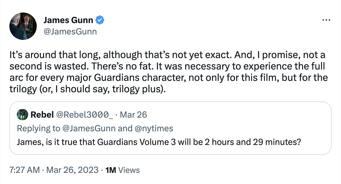 ดูเหมือนว่าการรํ่าลาเหล่านักสู้พิทักษ์จักรวาลเป็นครั้งสุดท้ายนี้จะยาวนานกว่าที่คิด โดยจากก่อนหน้านี้ที่มีการออกมาเปิดเผยว่าความยาวของภาพยนตร์ภาคปิดฉากนี้จะยาวกว่าภาพยนตร์ภาคก่อนหน้าทั้งหมด และในตอนนี้ผู้กำกับ เจมส์ กันน์ ก็ได้ออกมายืนยันแล้วว่าความยาวของ Guardians of the Galaxy Vol. 3 (2023) หรือ รวมพันธุ์นักสู้พิทักษ์จักรวาล 3 จะมีความยาวอยู่ที่ประมาณ 2 ชั่วโมง 30 นาที
