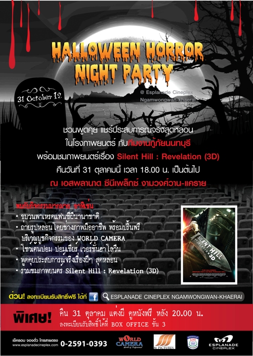 ชวนพูดคุย แชร์ประสบการณ์จริงเรื่องผีๆสุดหลอนในโรงภาพยนตร์ พร้อมชมภาพยนตร์รอบพิเศษ เรื่อง "SILENT HILL : REVELATION 3D" พร้อมสนุกกับบูธกิจกรรมต่างๆมากมาย วันที่ 31 ตุลาคมนี้ เวลา 18.00 น. เป็นต้นไป