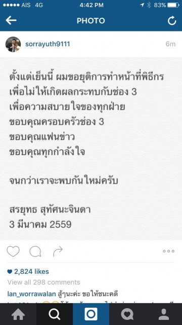 นายสรยุทธ สุทัศนะจินดา ประกาศยุติบทบาทหน้าที่พิธีกรในรายการเรื่องเล่าเช้านี้แล้ว