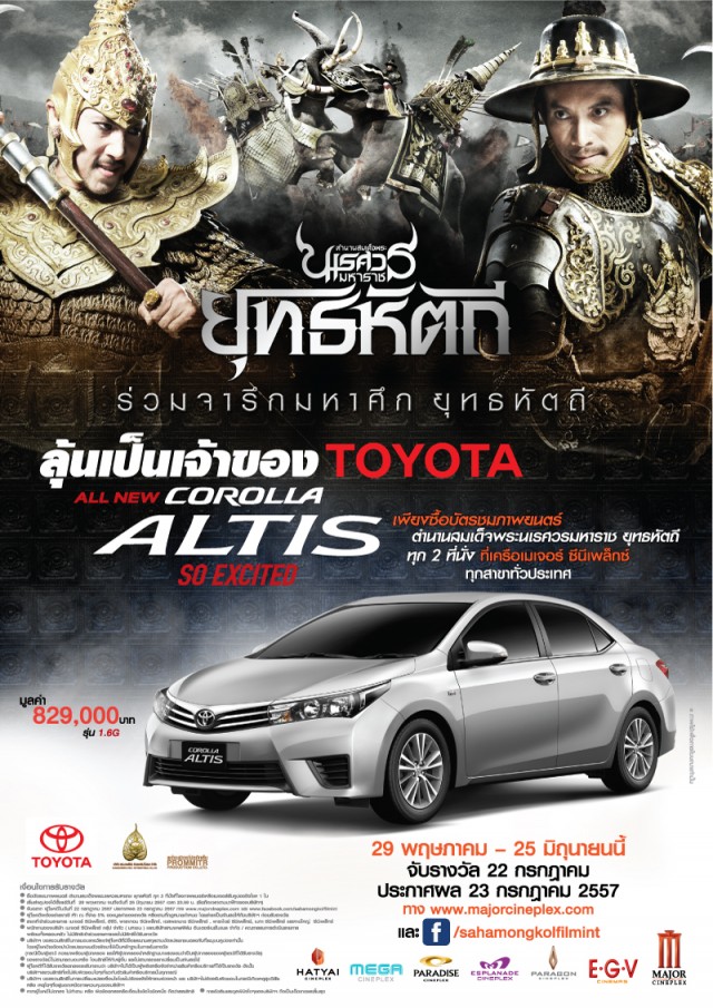 ร่วมลุ้นเป็นเจ้าของรถยนต์ TOYOTA ALL NEW COROLLA ALTIS รุ่น 1.6 G มูลค่า 829,000 บาท เมื่อซื้อบัตรชมภาพยนตร์ "ตำนานสมเด็จพระนเรศวรมหาราช ยุทธหัตถี" ทุก 2 ที่นั่ง ที่โรงภาพยนตร์ในเครือเมเจอร์ ซีนีเพล็กซ์ ทุกสาขาทั่วประเทศ