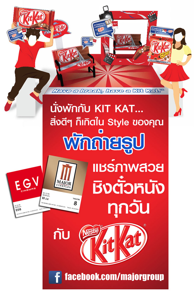 กิจกรรมพิเศษสำหรับสมาชิกแฟนเพจ www.facebook.com/majorgroup เมเจอร์ ซีนีเพล็กซ์ ร่วมกับ KIT KAT ชวนคุณมาโพสท์ท่าที่คิดว่า ชิลล์ ที่สุด บนเก้าอี้ Kit Kat chair ที่บูธ KIT KAT บริเวณโรงภาพยนตร์ เมเจอร์ ซีนีเพล็กซ์ รัชโยธิน, รังสิต, เซ็นทรัลปิ่นเกล้า, เมกา ซีนีเพล็กซ์ และ เอสพลานาด ซีนีเพล็กซ์ รัชดา แล้วส่งมาประกวดได้ที่ http://www.facebook.com/events/310792812348883/ ภาพไหนที่โดนใจทีมงานที่สุด รับบัตรชมภาพยนตร์ฟรี ทุกสัปดาห์ๆ ละ 5 รางวัลๆ 2 ที่นั่ง ระยะเวลา : ตั้งแต่ 15 มิ.ย.-31 ก.ค.55 พิเศษ ลุ้นรับ Gift set Kit Kat สำหรับ 10 รูปที่ถูก Share มากที่สุด ประกาศผล 5 ส.ค.55 ที่ www.facebook.com/majorgroup