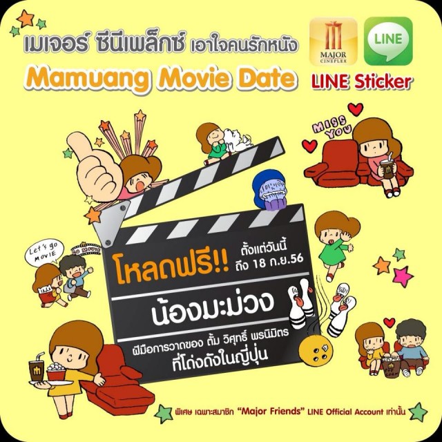 เมเจอร์ ซีนีเพล็กซ์ เค้าเอาใจคนรักหนัง ส่งสติ๊กเกอร์ไลน์ “น้องมะม่วง มูฟวี่เดท” ฝีมือการวาดของคุณตั้ม วิศุทธิ์ พรนิมิตร ผู้สร้างสรรค์สติ๊กเกอร์น้องมะม่วงที่โด่งดังในญี่ปุ่น พิเศษ 16 ลายใหม่ล่าสุด โหลดฟรี ตั้งแต่วันนี้-18 กันยายน ที่ Line Sticker shop พิเศษเฉพาะ Line Majorfriends เท่านั้น