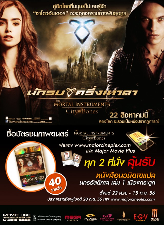 พิเศษ ซื้อบัตรชมภาพยนตร์ The Mortal Instruments City of Bones ทุก 2 ที่นั่ง ผ่านทาง Major Movie Plus และ www.majorcineplex.com ลุ้นรับ หนังสือนวนิยายแปล นครรัตติกาล เล่ม 1 เมืองกระดูก จำนวน 40 รางวัล
