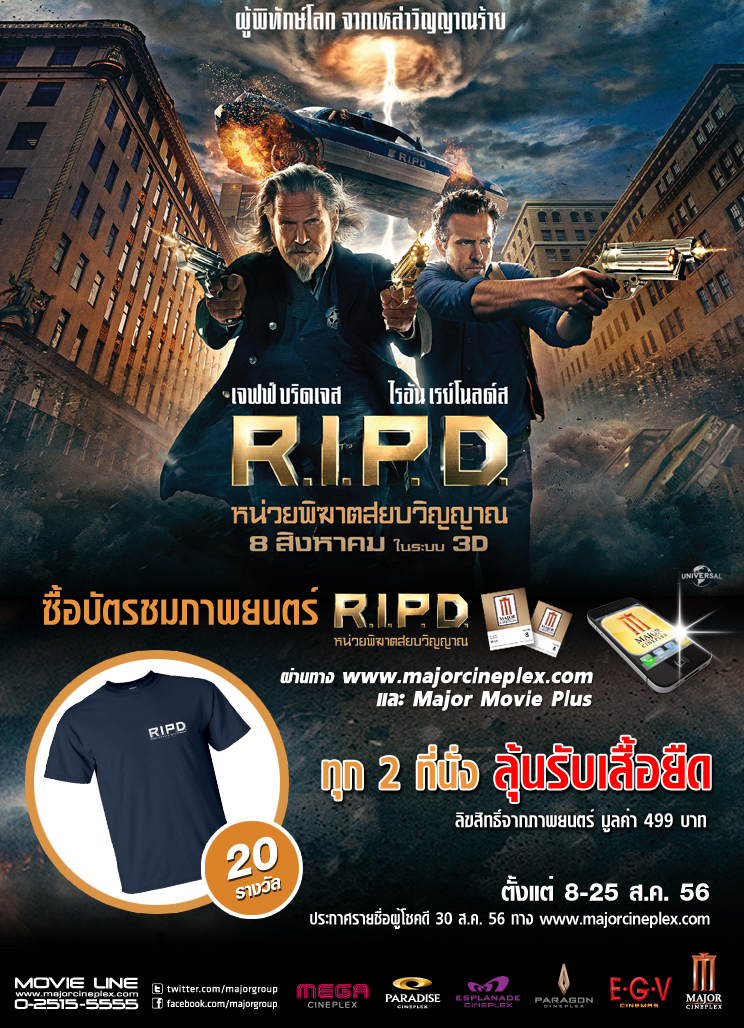 พิเศษ ซื้อบัตรชมภาพยนตร์ R.I.P.D ทุก 2 ที่นั่ง ผ่านทาง Major Movie Plus และ www.majorcineplex.com ลุ้นรับ เสื้อยืดลิขสิทธิ์จากภาพยนตร์ มูลค่า 499 บาท จำนวน 20 รางวัล