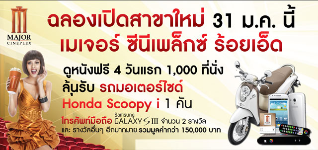 เมเจอร์ ซีนีเพล็กซ์ กรุ้ป ฉลองเปิดสาขาใหม่เป็นสาขาที่ 2 ของปี 2556 หลังเปิดแบรนด์ อีจีวี สาขาแม่สอด สาขาที่ 57 ไปเมื่อ 10 มกราคม 2556  ล่าสุดเปิด “เมเจอร์ ซีนีเพล็กซ์ร้อยเอ็ด”    สาขาที่ 58 ในวันที่ 31 มกราคม 2556 กับ 5 โรงภาพยนตร์ กว่า 1,200 ที่นั่ง ที่ บิ๊กซี ซูปเปอร์เซ็นเตอร์  เปิดให้ลูกค้าดูหนังฟรี 4 วันแรกที่เปิดบริการ1,000 ที่นั่ง ตั้งแต่วันที่ 31 มกราคม - 3 กุมภาพันธ์ 2556  นอกจากนี้ ลูกค้าที่ซื้อบัตรชมภาพยนตร์ทุก 2 ที่นั่ง ตั้งแต่วันที่ 31 มกราคม - 31 มีนาคม 2556 รับคูปองชิงโชค 1 ใบ พิเศษสมาชิกบัตร M Gen รับเพิ่มเป็น 2 ใบ  ส่งลุ้นรับรางวัล...