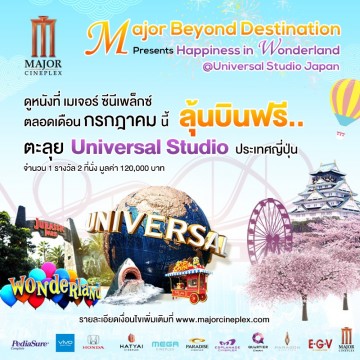เมเจอร์ ซีนีเพล็กซ์ ชวนคุณส่ง SMS ลุ้นบินฟรี ตะลุย Universal Studio ประเทศญี่ปุ่น เพียงซื้อบัตรชมภาพยนตร์เรื่องใดก็ได้ ในเดือนกรกฏาคมนี้ ร่วมสนุกโดยพิมพ์ JP#ตามด้วยหมายเลขหลัง Tax invoice ของตั๋วหนัง ส่ง SMS มาที่ 4545111 (ครั้งละ 3 บาท)