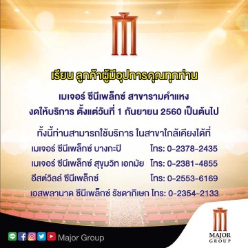 เมเจอร์ ซีนีเพล็กซ์ สาขารามคำแหง งดให้บริการ ตั้งแต่วันที่ 1 กันยายน 2560 เป็นต้นไป