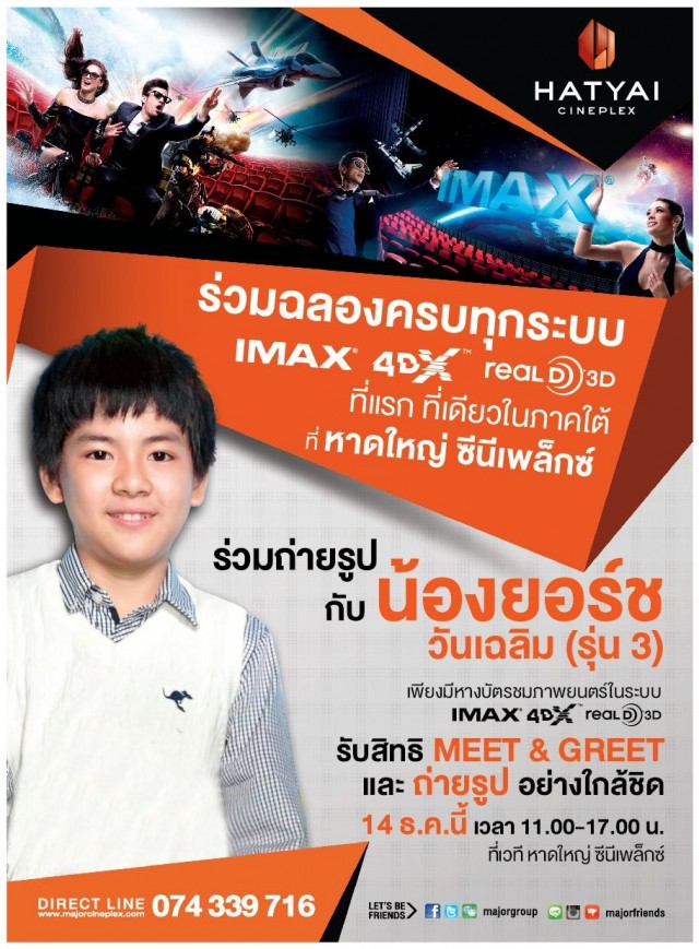 ร่วมฉลองครบทุกระบบ  IMAX 4DX RealD 3D ที่แรกที่เดียวในภาคใต้ ที่ หาดใหญ่ ซีนีเพล็กซ์ ร่วมถ่ายรูปกับ น้องยอร์ช วันเฉลิม (รุ่น3) เพียงมีหางบัตรชมภาพยนตร์ในระบบ IMAX 4DX & RealD3D รับสิทธิ์ MEET&GREET และถ่ายรูปอย่างใกล้ชิด 14 ธ.ค.นี้ เวลา 11.00-17.00 น.ที่ เวที หาดใหญ่ ซีนีเพล็กซ์