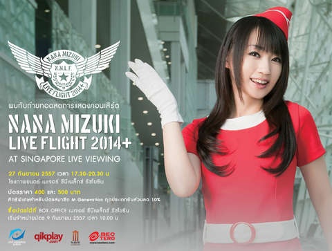 “NANA MIZUKI FLIGHT 2014+ at Singapore” which will be held at Resorts World™ Theatre, Resorts World Sentosa, Singapore on September 27th, 2014 will be live broadcasted to Japan, Asia Thailand The live is an additional performance of her live tour “NANA MIZUKI LIVE FLIGHT 2014” along with total of 14 performances at 11 venues in Japan. In this additional tour, she will hold her first solo live in Singapore where she made a special appearance at AFA, addition to performances in Taiwan where she held her first oversea live last year During the two-day concert in Taiwan last year , not only fans were singing along “SUPER GENERATION” on the first day and “POWER GATE” on the second day in Japanese, but they were also preparing surprise, holding up original papar fans which they made for her. Her first oversea live was finished with warm excitement and it also proved that Nana Mizuki is deeply loved by Taiwanese fans too. And, this year, the enthusiasm from Singapore will be delivered  to Japan Thailand and other Asia countries via special live broadcast! What kind of live will she perform this year? Either you are watching the live on big screen at movie theaters or gathering with friends in group and singing along at karaoke. Let’s share the unforgettable moments together! กลับมาอีกครั้งกับการทัวร์คอนเสริ์ตของนักร้อง  นักพากย์ และนักแต่งเพลงสาว J-POP อย่าง “Mizuki Nana” ใน “NANA MIZUKI LIVE FLIGHT 2014+” โดยครั้งนี้จัดขึ้นที่รีสอร์ทเวิลด์ เซ็นโตซ่า ประเทศสิงคโปร์ในวันที่ 27 กันยายน2014 ซึ่งจะมีการถ่ายทอดสดให้แฟนเพลงของเธอได้ชมพร้อมกันทั่วเอเชียรวมถึงญี่ปุ่นและประเทศไทยด้วย “NANA MIZUKI LIVE FLIGHT 2014”นั้นเป็นทัวร์คอนเสิร์ตของ Mizuki Nana ในปี 2014 โดยมีกำหนดจัดขึ้นในประเทศทั้งหมด 14 รอบ 11สถานที่ ในญี่ปุ่น ระหว่างวันที่ 1 มิถุนายน – 3 สิงหาคม 2014 และมีจัดนอกประเทศอีก 3 รอบ โดยจะใช้ชื่อว่า NANA MIZUKI LIVE FLIGHT 2014 + ที่สิงคโปร์ในวันที่ 27 กันยายน 2014 และที่ไต้หวันในวันที่ 4 – 5 ตุลาคม 2014 ซึ่งครั้งนี้ถือว่าพิเศษสุดพราะเป็นการโชว์คอนเสริ์ตเดี่ยวครั้งแรกของเธอในสิงคโปร์อีกด้วย หลังจากโชว์ในต่างประเทศครั้งแรกของเธอที่ไต้หวันเมื่อปี่ที่แล้วประสบความสำเร็จมากมาย มีแฟนเพลงมาให้กำลังใจเธออย่างอบอุ่นทั้งถือป้ายทำเซอร์ไพรส์ และร้องเพลงฮิตของเธออย่าง “SUPER GENERATION”และ “POWER GATE”ตามกันได้อีกด้วย ทำให้คอนเสริ์ตในครั้งนั้นจบลงอย่างน่าตื่นเต้นและประทับใจ ซึ่งก็เป็นการพิสูจน์ว่านอกจาก“Mizuki Nana” เธอจะเป็นที่รักจากแฟนเพลงในญี่ปุ่นแล้ว แฟนๆในต่างประเทศก็ชื่นชอบเธอมากมายไม่แพ้กัน ย้ำอีกครั้งว่า “NANA MIZUKI LIVE FLIGHT 2014+” ที่สิงคโปร์ในครั้งนี้ จะมีการถ่ายทอดสดพิเศษส่งตรงไปยังประเทศญี่ปุ่น  และทั่วภูมิภาคเอเชีย รวมถึงประเทศไทยด้วย!   งานนี้แฟนคลับไอดอลสาวมากความสามารถ Mizuki Nana ไม่ควรพลาดมาให้กำลังใจเธอ พร้อมร่วมแบ่งกันช่วงเวลาแห่งความสุขและน่าจดจำกันอีกครั้ง ในบรรยากาศสดๆแบบเต็มตาบนจอขนาดใหญ่ในโรงภาพยนตร์ 27 กันยายนนี้