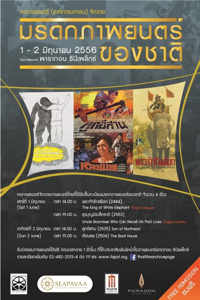 MORADOK FILM โรงภาพยนตร์พารากอน ซีนีเพล็กซ์ และ หอภาพยนตร์ (องค์การมหาชน) เชิญชมฟรี ภาพยนตร์ที่เคยได้รับการขึ้นทะเบียนมรดกภาพยนตร์ของชาติ จำนวน 4 เรื่อง ระหว่างวันที่ 1 - 2 มิ.ย 56 ฟรีไม่เสียค่าใช้จ่าย !!!