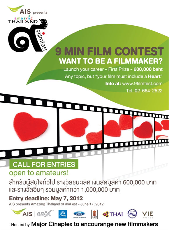 9 Min Film Contest โครงการประกวดหนังสั้น 9 นาที ใน Concept "หัวใจ" ชิงเงินรางวัลชนะเลิศ เงินสด 600,000 บาท และรางวัลอื่นๆ รวมมูลค่ากว่า 1,000,000 บาท สำหรับผู้สนใจทั่วไป รับสมัคร วันนี้ - 7 พฤษภาคม 2555 รายละเอียดเพิ่มเติมที่ www.9filmfest.com