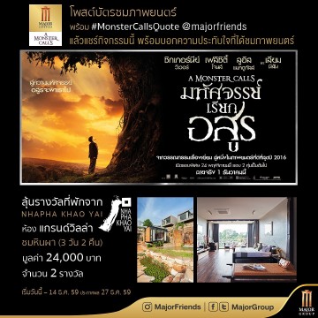 โพสท์ตั๋วหนัง A Monster Call ใต้ comment แล้วแชร์กิจกรรมนี้ พร้อมบอกความประทับใจที่ได้ชมภาพยนตร์ #MonsterCallQuote #majorfriends ลุ้นรับ บัตรห้องแกรนด์วิลล่า ชมหินผา 3 วัน 2 คืน ที่ NHAPHA - KHAO YAI มูลค่า 24,000 บาท จำนวน 2 รางวัล (รวมอาหารเช้า)