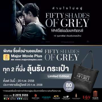 • สิทธิพิเศษเฉพาะลูกค้าที่ซื้อบัตร เรื่อง Fifty Shade of Grey ทุก 2 ที่นั่ง ผ่านทาง Application “Major Movie Plus” และเว็บไซต์ www.majorcineplex.com โดยทำรายการชำระเงินผ่านเว็บไซต์ และ Application เท่านั้น