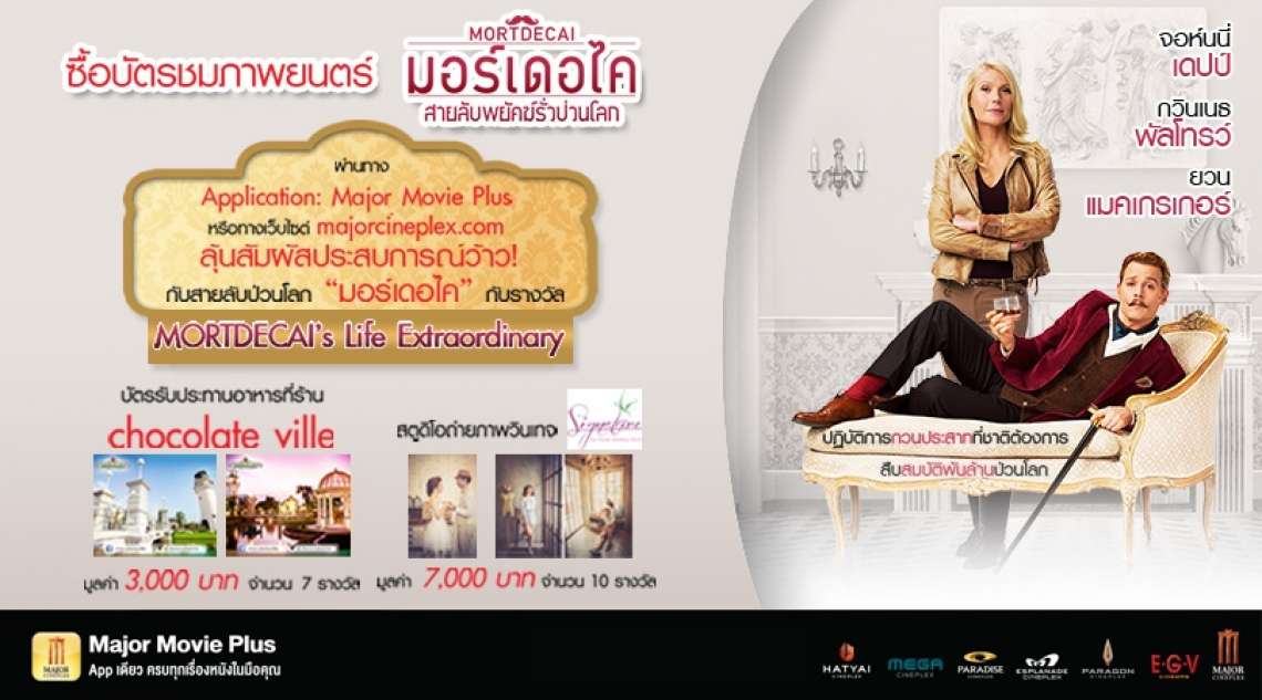 - สิทธิพิเศษเฉพาะลูกค้าที่ซื้อบัตร เรื่อง Mortdecai ผ่านทาง Application “Major Movie Plus” และเว็บไซต์ www.majorcineplex.com โดยทำรายการชำระเงินผ่านเว็บไซต์ และ Application เท่านั้น