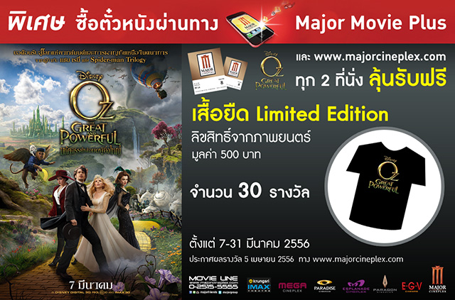 ซื้อตั๋วหนัง Oz: The Great and Powerful ทุก 2 ที่นั่ง ผ่านทาง Major Movie Plus และ www.majorcineplex.com ลุ้นรับฟรี เสื้อยืด Limited Edition ลิขสิทธิ์จากภาพยนตร์ จำนวน 30 รางวัล